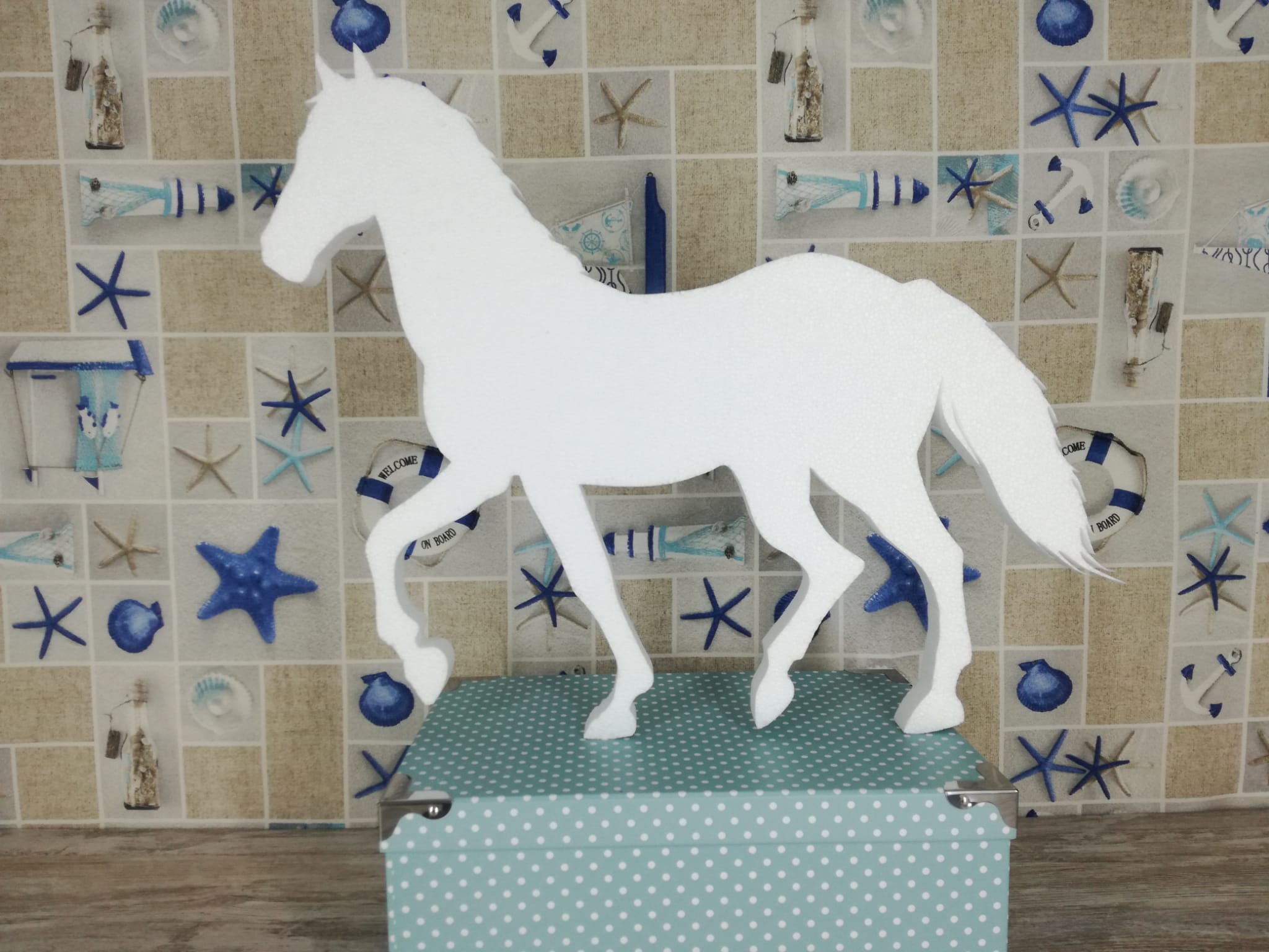 Este Caballito de corcho blanco mide 70 cm de altura, es ideal para poner delante de las carrozas photocall o bien puede ir solo en el suelo o una mesa.