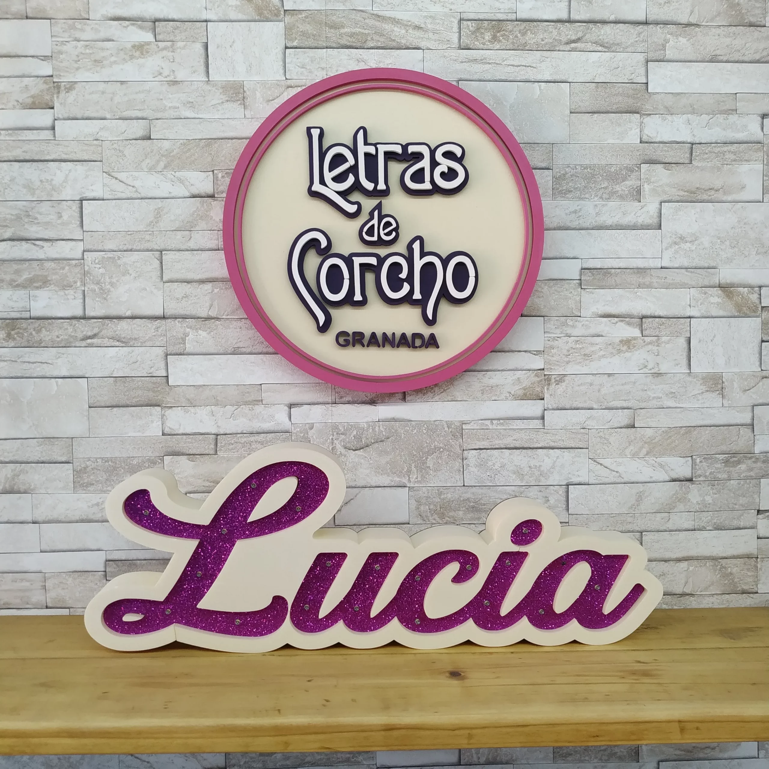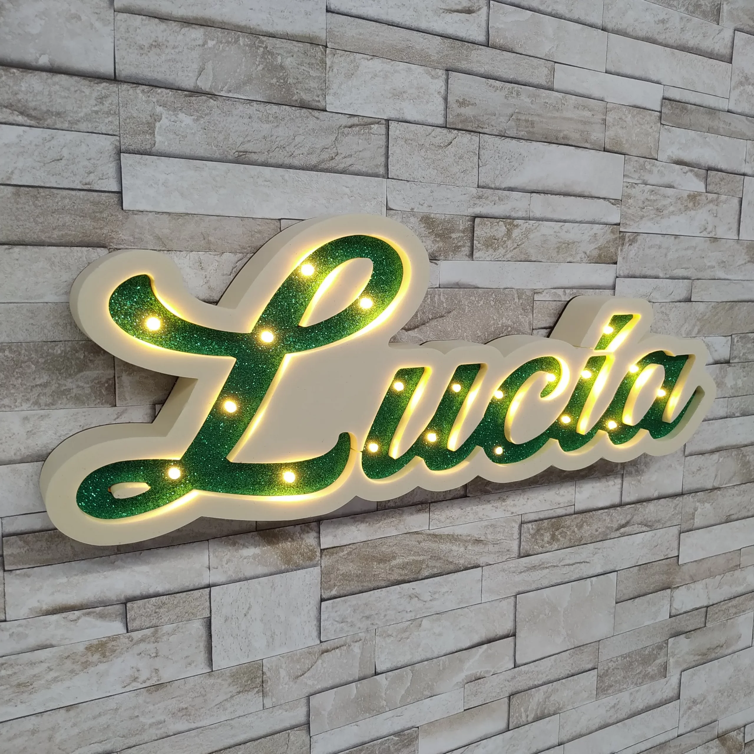Nombre con luces  y purpurina.