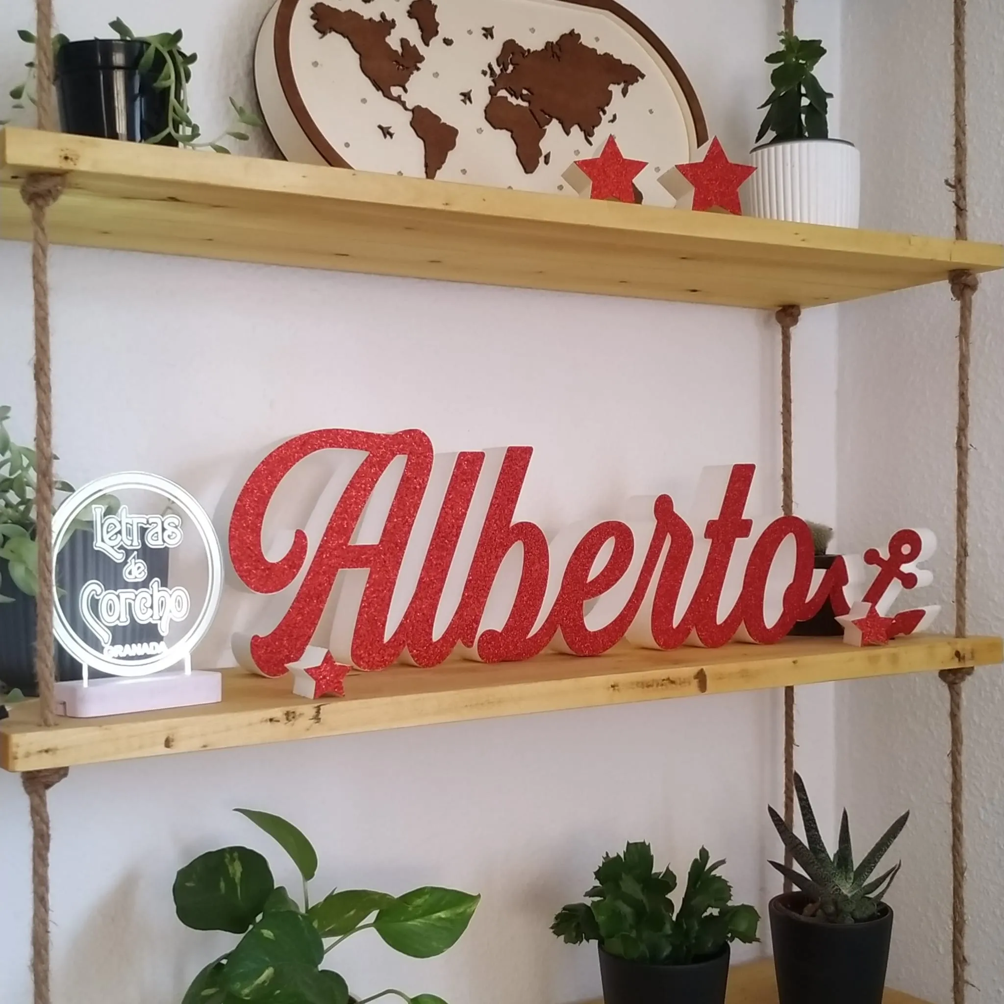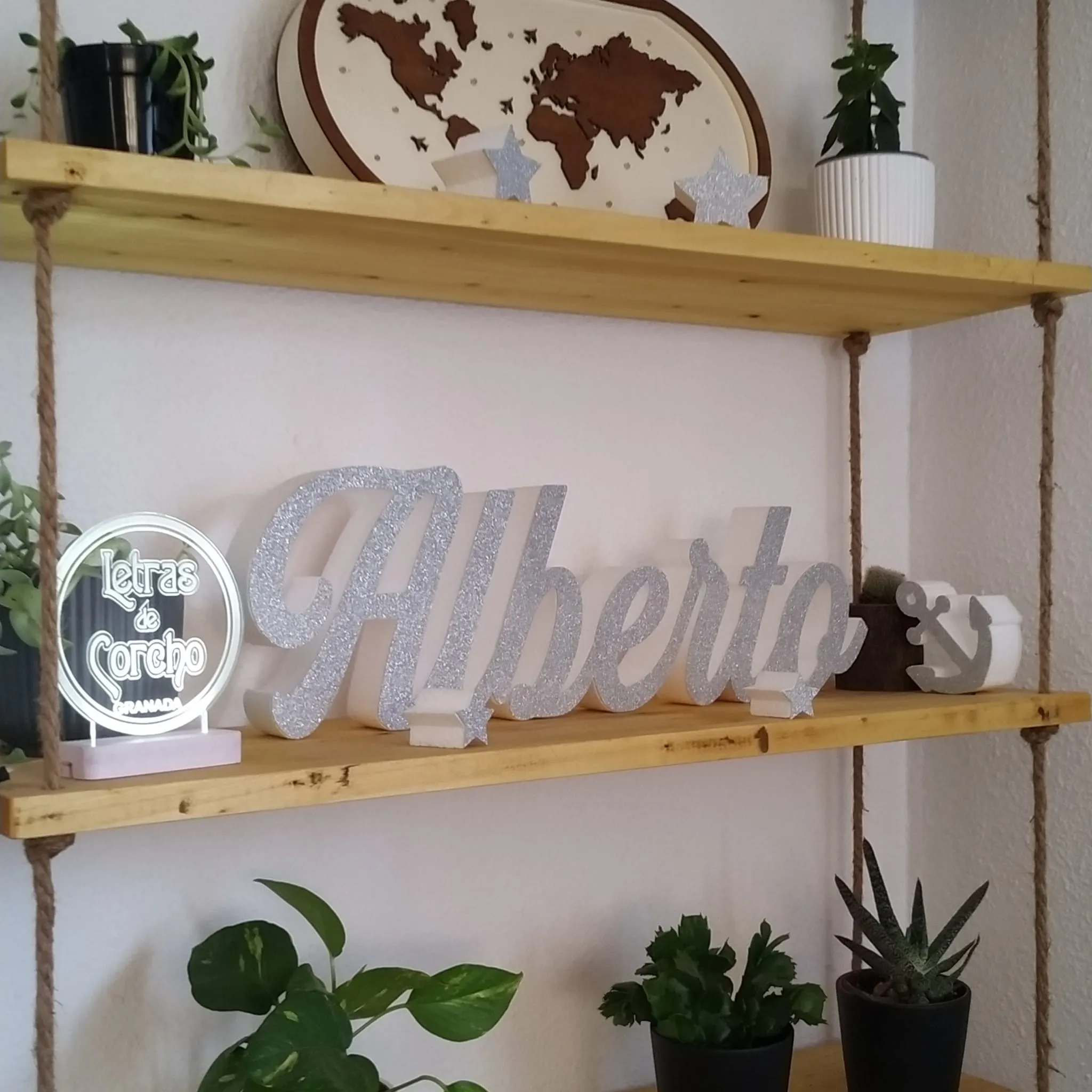 Nombre con purpurina de corcho blanco de alta densidad con frente de purpurina.